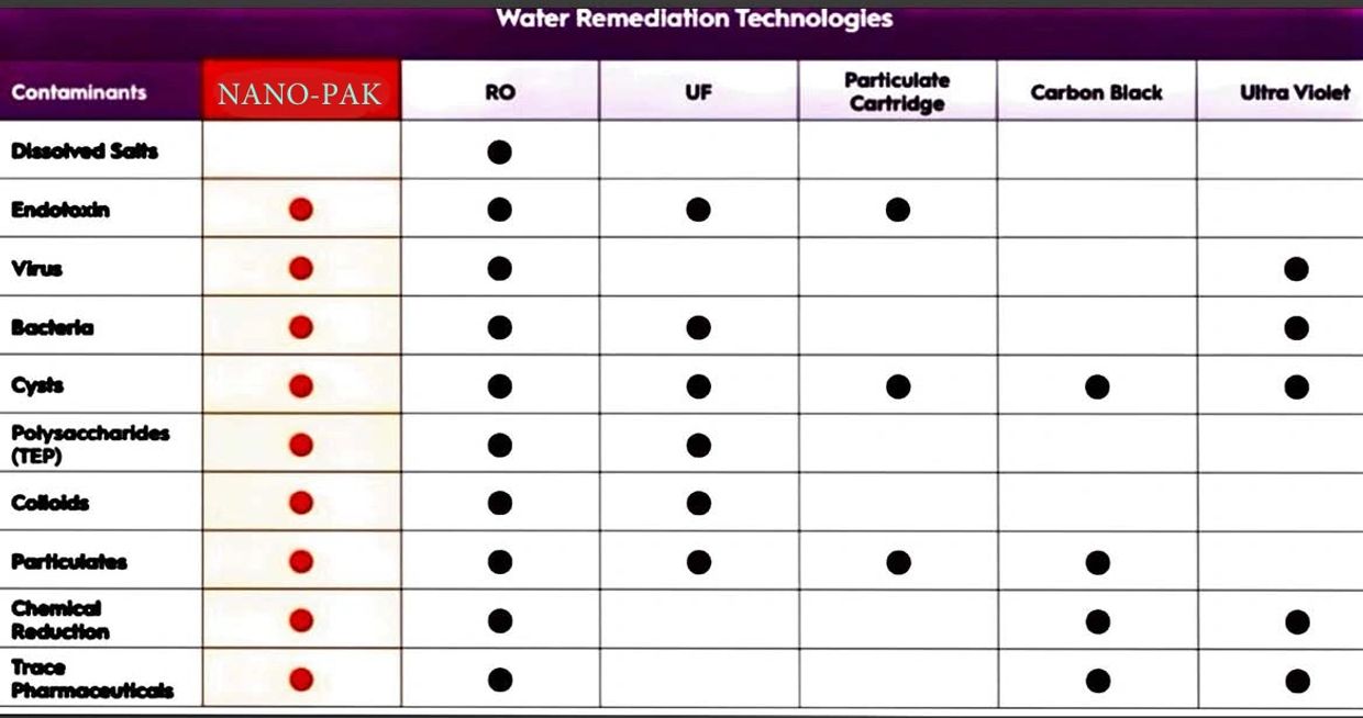 Nano-Pak is an electro-adsorptive technology. It uses an electrical charge to remove very small pathogens, like E.coli and Legionella, from the water, while ensuring the healthy minerals that are good for us remain.” This single-source approach to purification is also the most sustainable.